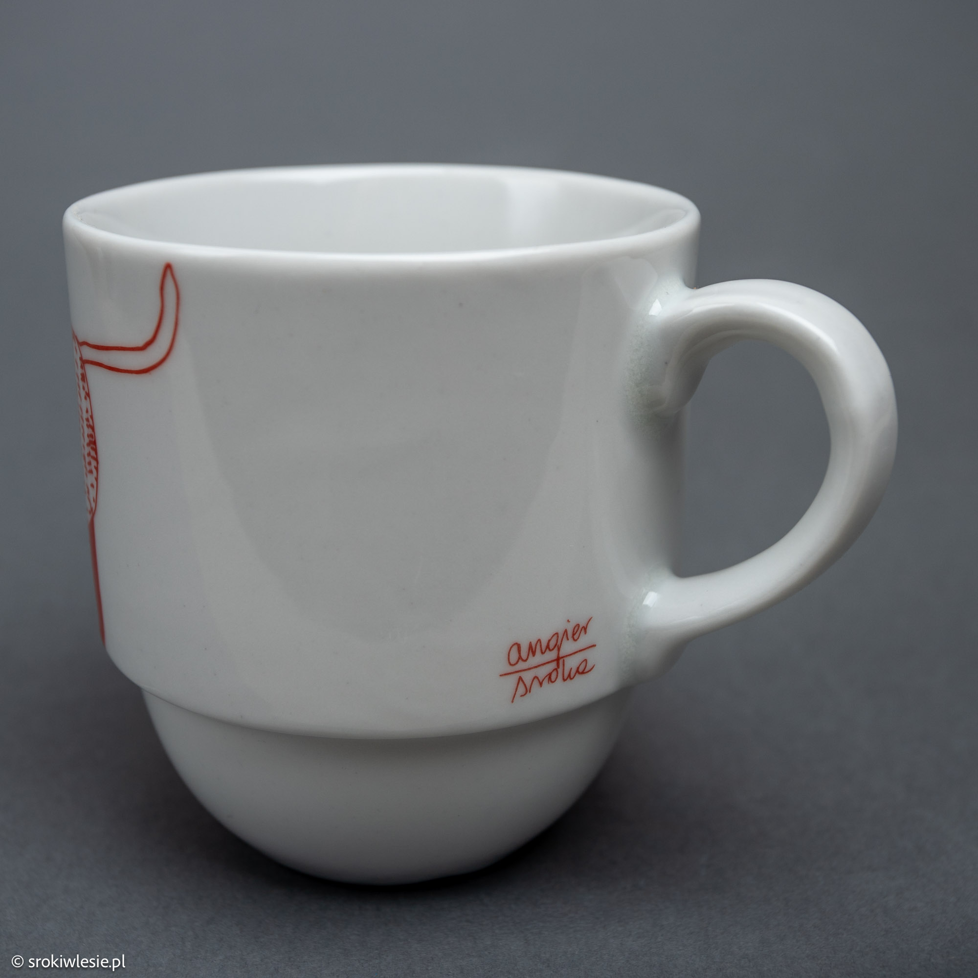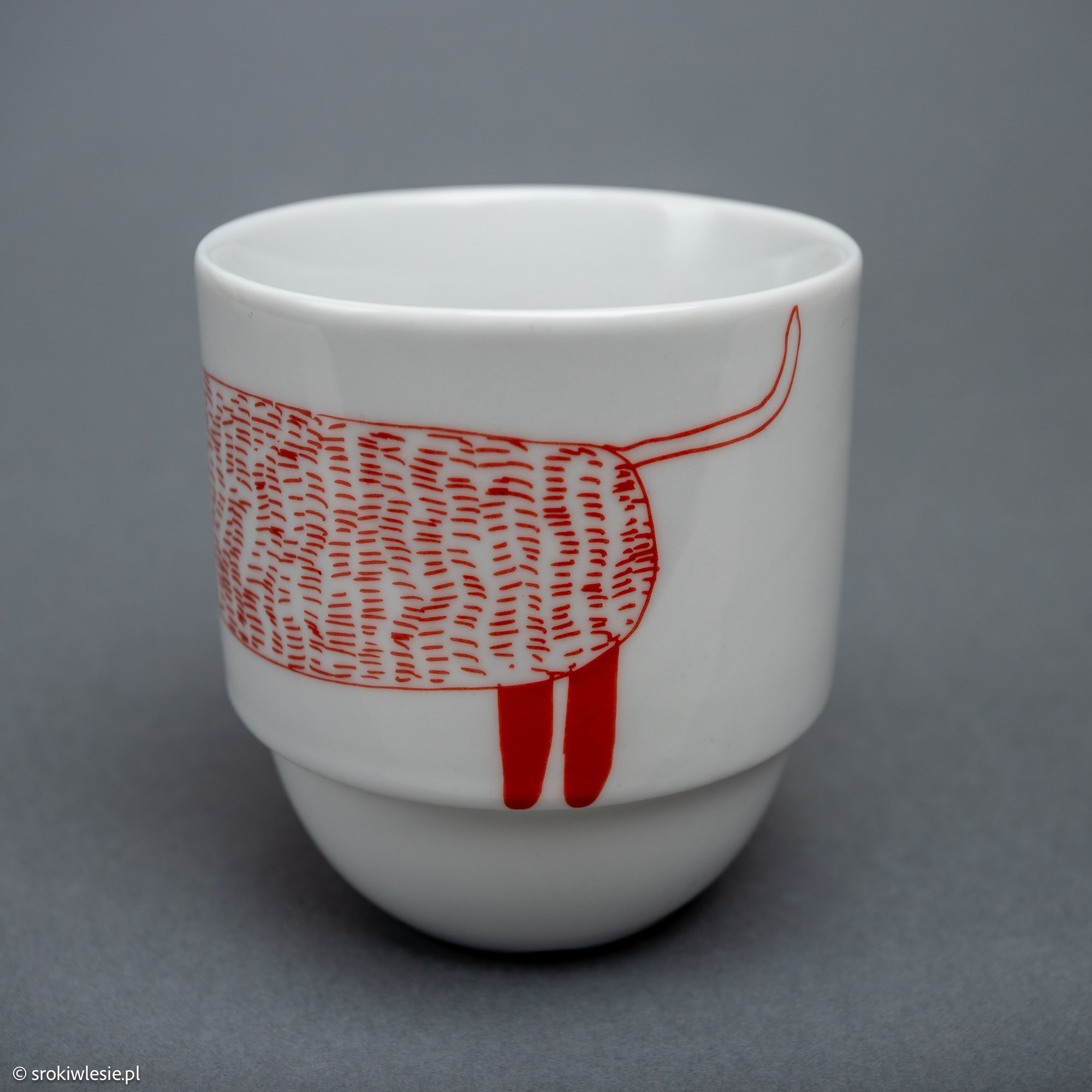 Porcelanowy kubek z czerwonym jamnikiem, który bawi się w berka ze swoim ogonem 🙂